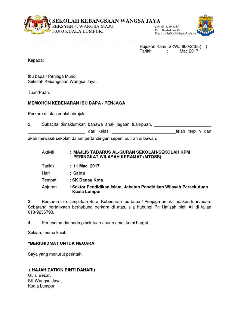 Borang permohonan membawa telefon bimbit seperti di lampiran b. Tuan, memohon menggunakan dewan untuk pertandingan bercerita merujuk perkara di atas, dimaklumkan bahawa persatuan bahasa malaysia sekolah ini akan mengadakan pertandingan bercerita dalam bahasa melayu untuk murid tahap 1 dan 2. Surat kebenaran bawa murid aktiviti luar. Dana ini nantinya disalurkan ke pihak yang membutuhkan. Você está na página 1 de 2. Contoh surat pengesahan majikan dan jawatan ringkas mudah.